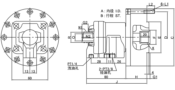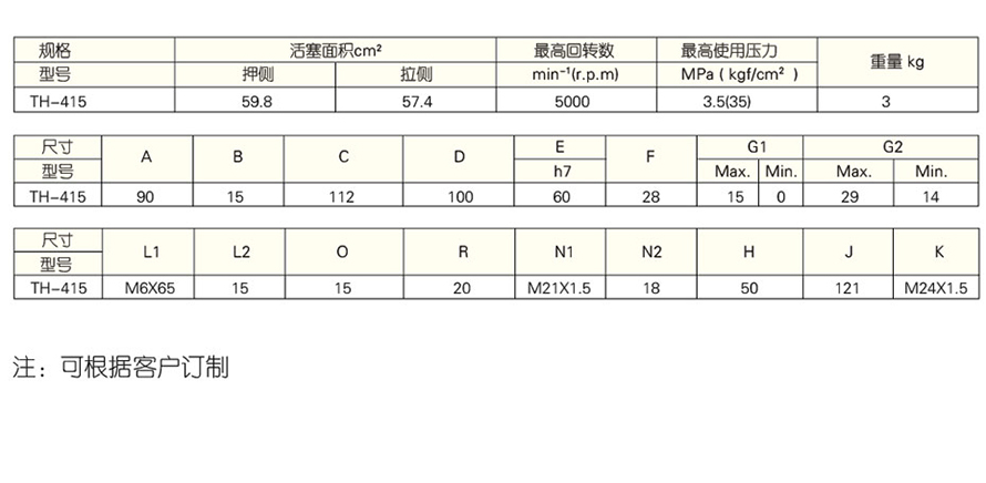 TH-415型小通孔型回轉(zhuǎn)油壓缸技術(shù)參數(shù) ·輕量型、超薄型、小通孔油缸 ·高速運(yùn)轉(zhuǎn)平衡,動(dòng)作反應(yīng)快,是儀表數(shù)控、自動(dòng)化設(shè)備理想的動(dòng)力源。 ·TH-415型小通孔型回轉(zhuǎn)油缸安裝方便,可尾端鎖固之